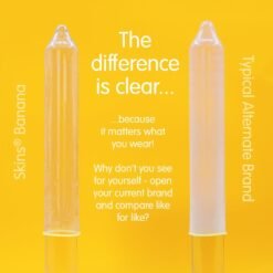 Delizia il tuo palato con la sensazione di gusto dei preservativi Skins Banana! 4 preservativi al gusto di banana, confezionati singolarmente per un facile utilizzo. Un bell'aspetto! Sentiti bene! Goditi un sesso naturalmente migliore con un preservativo che si adatta perfettamente a te. Così trasparente e sottile da sembrare una seconda pelle. I preservativi Skins ti permettono di godere in sicurezza senza rinunciare al piacere!